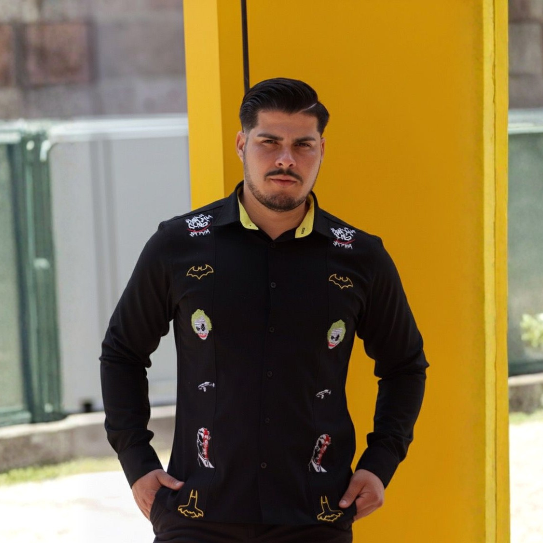 Made from 100% high-quality cotton, this black short-sleeved shirt combines cool, comfort, and bold design. Inspired by the world of urban culture's most iconic heroes and villains, it features detailed embroidery evoking the essence of a masked vigilante, a chaotic clown, a riddle master, and a double-dealing figure.